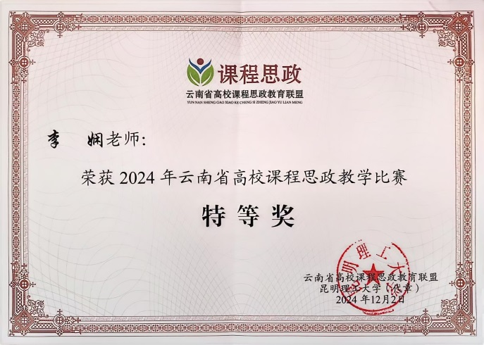 近日,2024年云南省高校课程思政教学比赛圆满落下帷幕。本次比赛由云南省高校课程思政教育联盟主办,昆明理工大学承办。经各高校校赛推荐、省级现场决赛,ballbet贝博李娴老师凭借出色的教学设计和精彩的现场教学表现,在激烈的竞争中脱颖而出,荣获课程思政教学比赛特等奖。