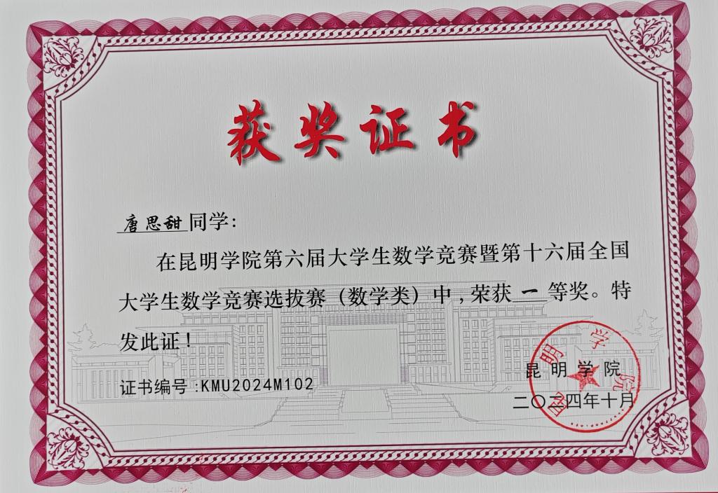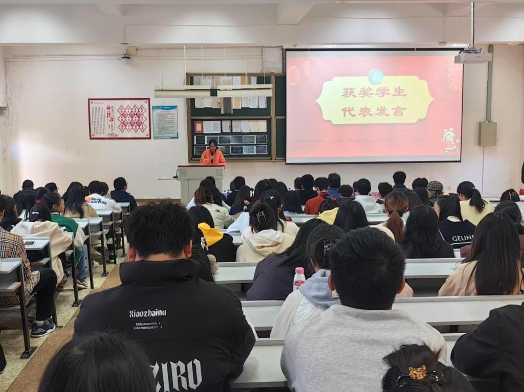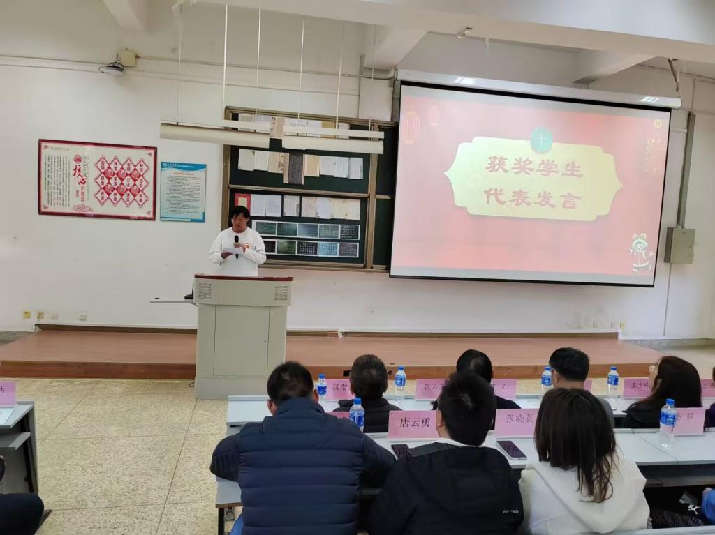 获得校赛一等奖、省赛获数学类一等奖第二名,备战国赛的获奖代表蔡鸿圆同学讲述了自己自学数学励志成才的经历,从转专业前自学数学参加竞赛,到转专业后勤学奋进,经过一年多的坚持不懈、努力奋斗,最终取得决赛资格,与全国学子角逐的入场券。他在自学之路上坚定信念、永不言弃、自我鼓劲,遇到困难和挫折从未放弃,展示了新时代昆院学子积极努力、砥砺奋进的优秀品质。
