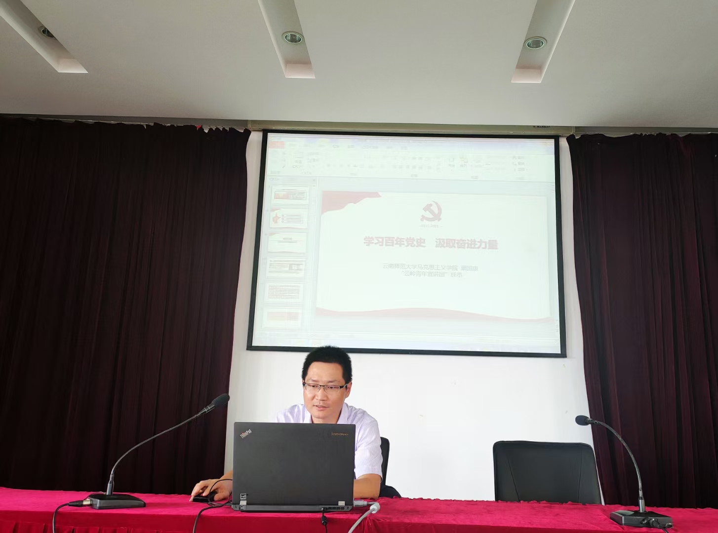 5月28日,ballbet贝博举办党史学习教育专题培训暨ballbet贝博“万名党员进党校”培训开班仪式;培训题目《学习百年党史 汲取奋进力量》,主讲为云岭青年宣讲团成员、昆明市委宣讲团成员、云南师范大学党史学习教育教师宣讲团成员、云南师范大学马克思主义公司党委委员、教职工第一党支部书记粟国康博士,ballbet贝博师生党员参加专题培训。
