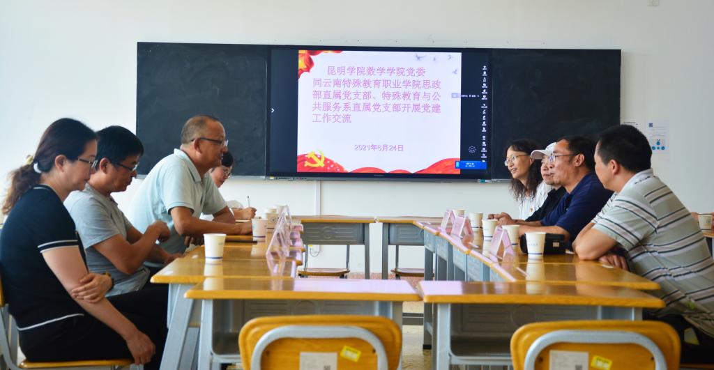 室,与云南特殊教育职业公司党委书记孙继先同志、思政部主任王丽萍同志、特殊教育与公共服务系直属党支部尹文静同志进行座谈交流,孙书记介绍了云南特殊教育职业公司,陈正祥同志介绍了ballbet贝博基本情况和党建工作开展情况,员工一支部书记施菲同志介绍了支部情况,双方就党建工作、党史学习教育情况、支部共建及交流合作进行了深入探讨。