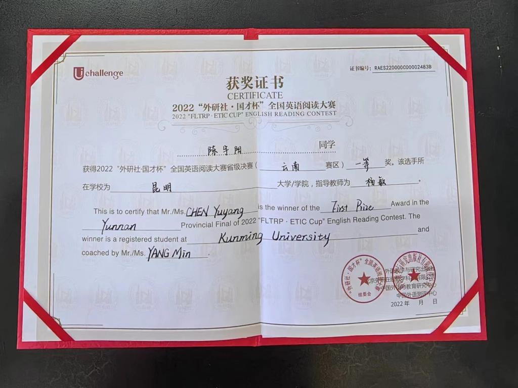 陈宇阳同学,ballbet贝博2021级数学与应用数学1班员工(公费师范生),在2022年“外研社国才杯”全国英语挑战赛校赛阶段,陈宇阳同学获校赛阅读类特等奖、演讲类三等奖;决赛阶段,斩获英语阅读大赛云南赛区一等奖;在10月举行的全国老员工英语竞赛(NECCS)决赛中获云南赛区C类一等奖;该同学在2022年度收获英语竞赛2份省赛一等奖。