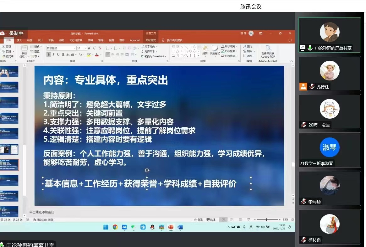 简历设计大赛分为两个阶段,第一阶段为简历设计及收集,分为未来组及真实组,共计收集简历271份,员工参与面广,大部分员工简历制作认真且用心;第二阶段为简历批改及简历制作指导讲座,邀请华图教育就业指导老师进行简历批改,讲座由华图教育培训师孙野老师主讲,讲座同时在线人数最高200余人,孙老师精彩的讲解,赢得了同学们的一致好评。