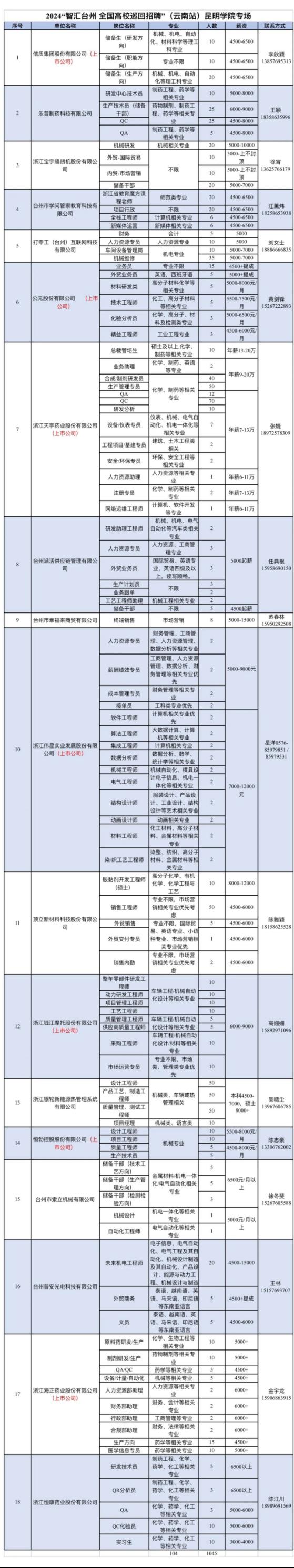 规模:本次招聘团共有18家台州企事业单位,其中上市公司7家,提供岗位104个,需求人数1045人。