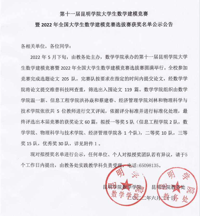 第十一届老员工数学建模竞赛暨2022年全国老员工数学建模竞赛选拔赛获奖名单公示公告